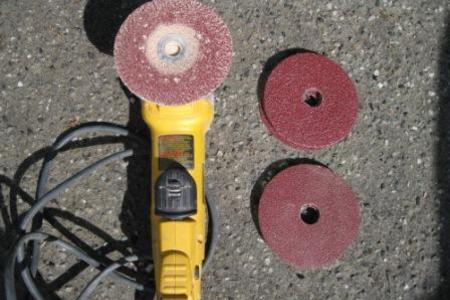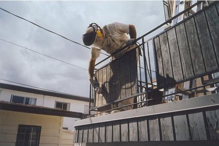 The first step, and one of the most important steps in the prep work stage, is the power sanding to remove loose paint. We have developed a unique sanding system that includes mini-grinders with sanding pads attached. Mini-grinders are much more powerful than other sanders and they are able to remove all loose paint down to the bare wood, even with thicknesses of 10 to 20 coats of paint. You can see the results below.